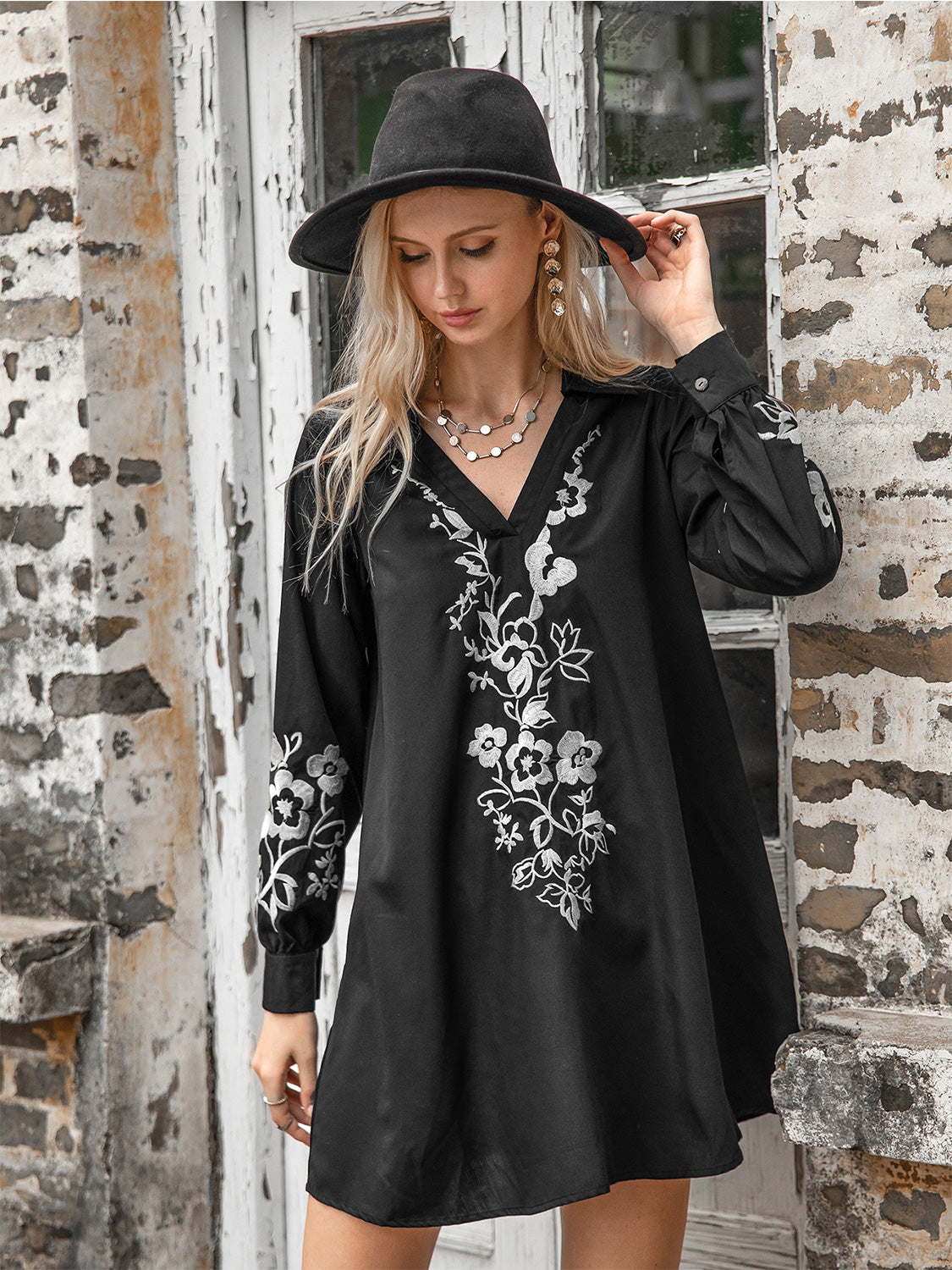Floral Collared Neck Long Sleeve Dress - Black / M