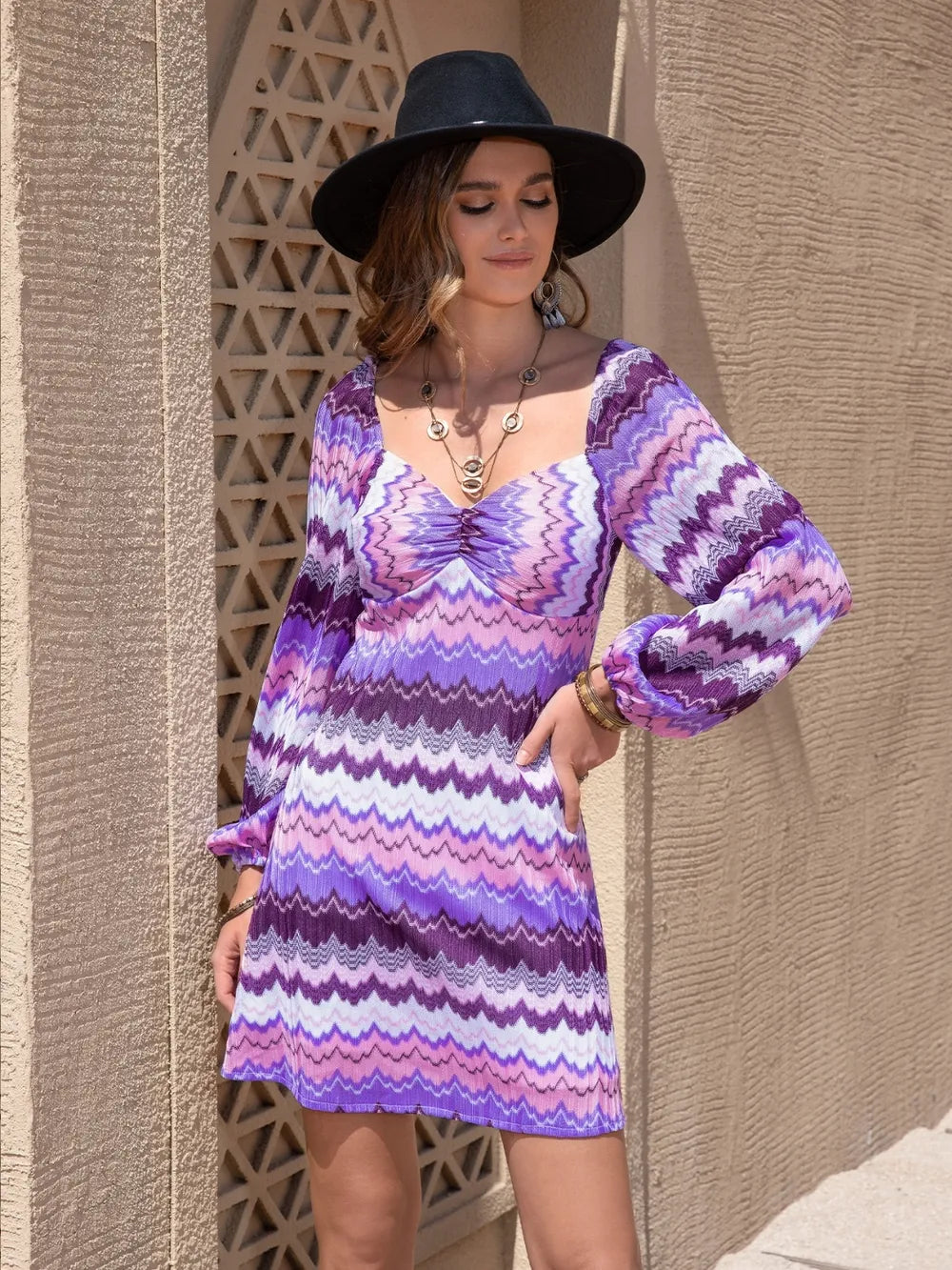 Printed Sweetheart Neck Balloon Sleeve Dress - Purple / S