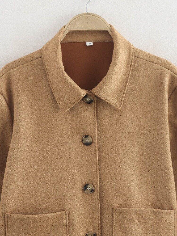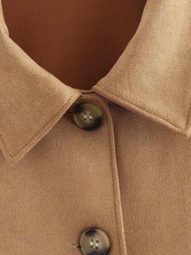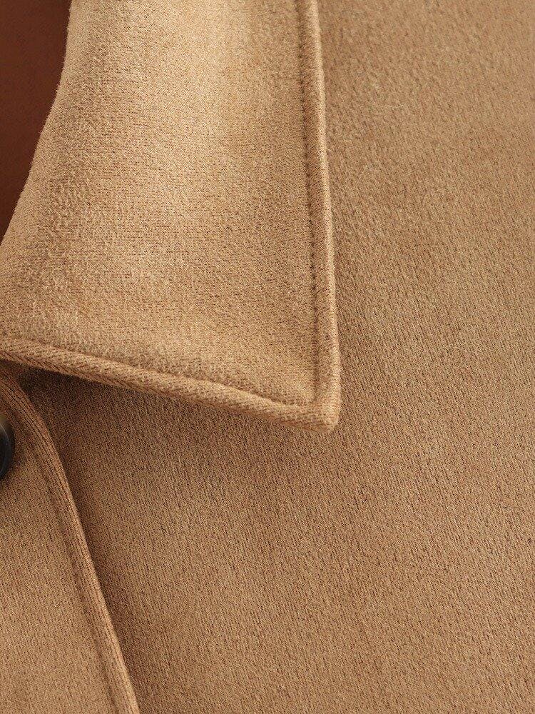 Women’s Camel Suede Coat with Button Closure – Mid-Length Outerwear